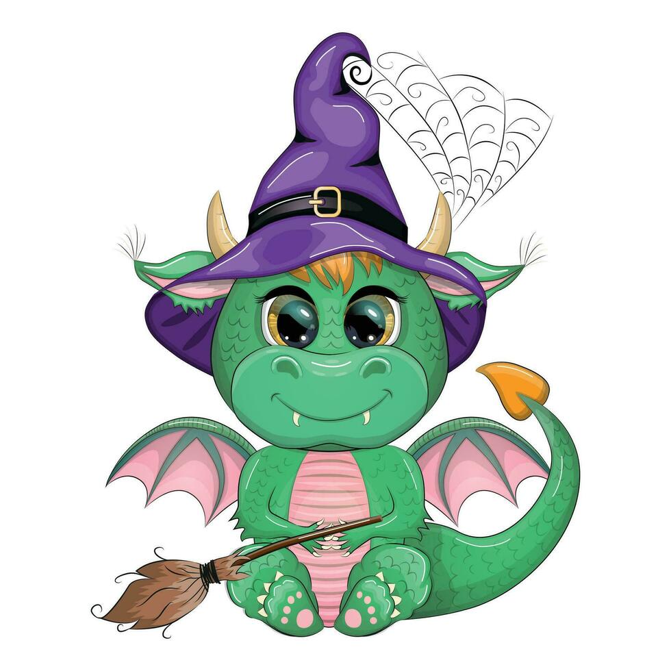 Source : www.freepik.comCute cartoon green dragon in a purple magic hat, Halloween. Symbol